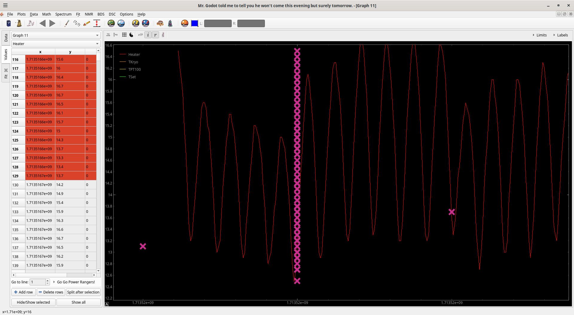 I have a temperature log which I want to plot and store alongside some data. I converted the human-readable timestamps into unix timestamps, which for a precision of 1 second have 10 digits (until near the end of the year 2286). The auswerteprogramm can correctly read and display the 10-digit numbers, but apparently stores and exports them with only 8-digit precision. Marking values displays the marks for datapoints with identical leading 8 digits on the same x-value (see screenshot).