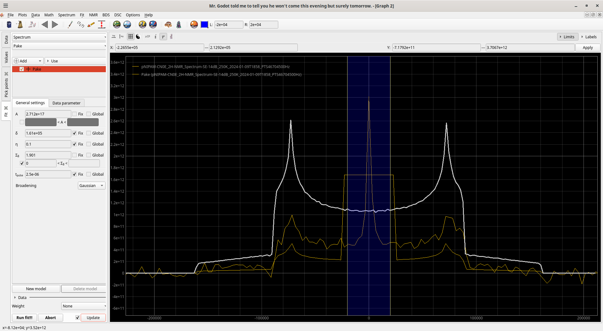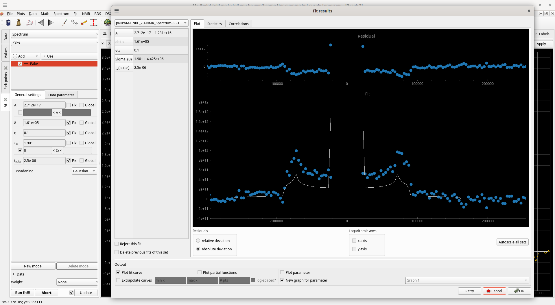 Trying to fit the data with a custom fit region with the right border on -2e4Hz, i.e. to the left of the Lorentzan-data, leads to the error