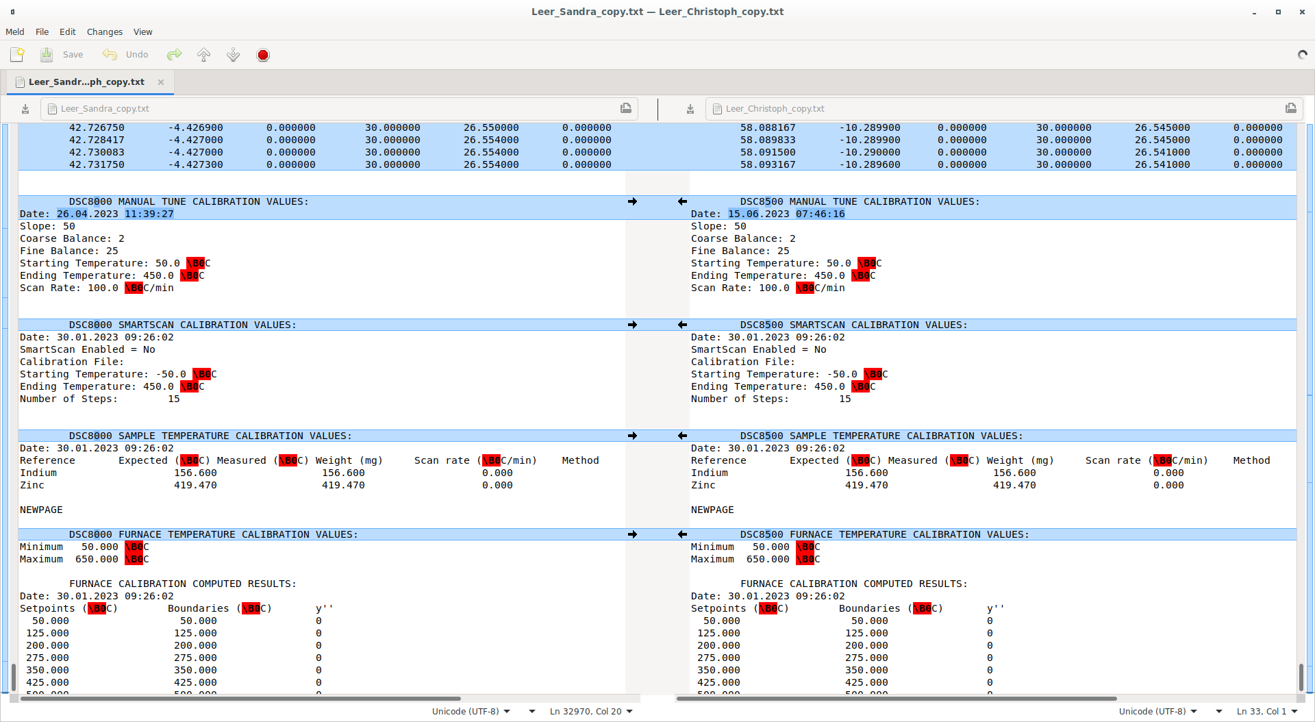 das Auswerteprogramm mag meine DSC Daten nicht einlesen, Sandras Daten allerdings schon. Die Dateien sehen für mich aber identisch aus. Vergleiche von Header und Footer der Dateien, sowie ErrorLogs (10:24 Uhr für Sandras Datei, 10:25 Uhr für meine) des Auswerteprogramms hänge ich an.
